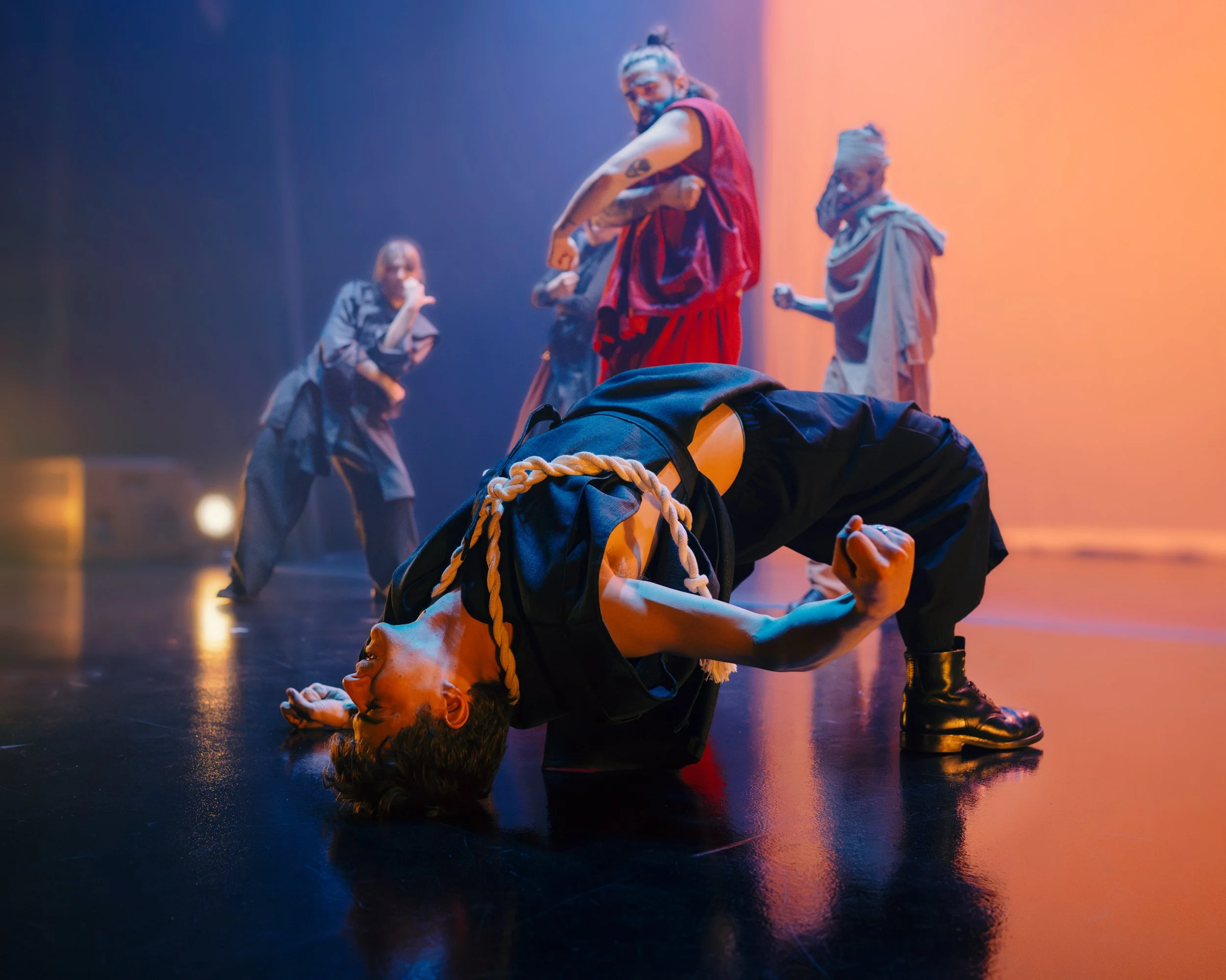 Avec SKLTR, 7Starr et Charles « Brøken » Brecard souhaitent pousser les interprètes dans l’exploration de personnages. « Le character est une des spécificités du krump. Chaque danseur en possède un ou plusieurs. Ses alter ego, élabore Charles. On voulait construire un univers, créer une mythologie, qui permet de faire une recherche profonde sur les characters et de les mettre ensemble ». Ainsi, les deux créateurs se sont entourés de cinq interprètes du milieu du krump : Valérie Chartier, aka Triple C, Robert Soare, aka Soare, Jules Talavera, aka Frenzy, Olivier Clermont, aka Swami et Mathilde Mercier-Beloin, aka PhoenX. « Ce sont des artistes très impliqué.e.s dans la communauté krump, certain.e.s sont des vétérans, des OG, d’autres des personnes de la nouvelle génération », précise 7Starr. Ainsi, pour chorégraphier SKLTR, les deux artistes ont amené des idées, des ambiances, des images, mais ont aussi échangé avec les interprètes afin qu’ils et elles développent leurs personnages. « On est allé.e.s très loin dans l’imaginaire de chacun.e, on a trouvé les missions, les origines et les intentions derrières chaque mouvement de chaque personnage », décrit Charles.